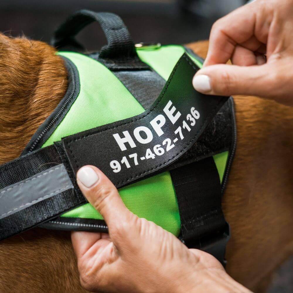 Harness has been a god send. Reflective strip is helpful with earlier dark evenings as well as early morning walks. Harness is easy to adjust on the front and underneath the belly.Quick release buckle makes it quick to place on and remove while in multiple positions. Personalized label is clear, reflective and is easily removed from the vest due to the Velcro backing on both sides. Large D ring on back of harness makes it easy to hook up and remove a leash. Nylon material makes it strong and easy to clean. This is a well made product that I highly recommend for medium to larger goal oriented outdoor dogs. :)
