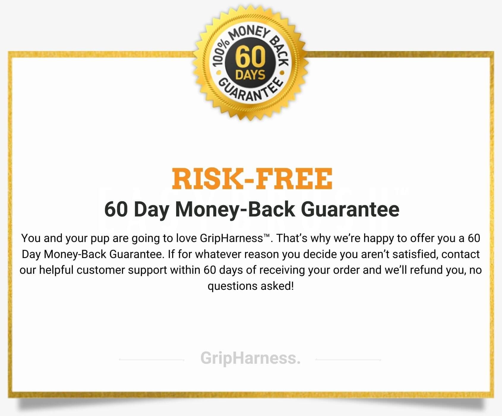 We assure you that you and your pup will love GripHarness! However, if you aren't satisfied with your order(most unlikely) or got the wrong size (rarely happens), just contact our helpful customer service team at support@gripharness.com and we will refund you. No questions asked!